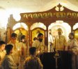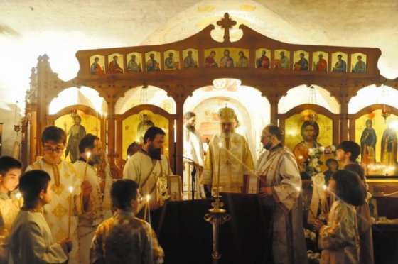 Programul s-a desfășurat pe mai multe zile. Am început în cripta noastră ortodoxă de la „Saint Sulpice”, joi seara, cu o priveghere. Am continuat vineri dimineață, de ziua sfintei, cu Acatistul și Dumnezeiasca Liturghie, la care au participat părintele protopop Marc Antoine Costa de Beauregard, părintele Gherasim, de la Putna, părintele Mircea Filip, împreună cu mama sfinției sale și cu credincioşii parohiei din La Courneuve, dar și alți slujitori. Sâmbătă dimineață s-a slujit arhiereasca Liturghie, cu participarea Preasfințitului Părinte Marc Nemțeanul, împreună cu un sobor de diaconi și preoți, în prezența unei biserici pline, ca în vremurile bune de dinainte de pandemie. Au venit în special confrați slujitori din regiunea pariziană, dar nu numai: părintele Nicolae Florea, de la Sucy en Brie, părintele Andrei Stanease şi diaconul Nicolae Zala, de la catedrală, părintele Florin Bucă, de la Fontainebleau, părintele Gherasim, de la Putna, părintele Ciprian, de la Auxerre și Paris, părintele Vasile Irimia, de la Vichy; dar și diaconii parohiei noastre, Ionel Codreanu și Cristian Suciu, în total doisprezece slujitori la împărtăşit. Poate pentru prima oară în istoria parohiei, am ieșit la împărtășire către credincioși cu patru potire.