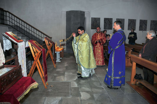 Sfânta Liturghie a fost săvârşită de către părintele paroh Alexandru Nan în biserica Sfântul Lucian (St. Luzi Kirche) din oraşul Chur, ajutat de către ipodiaconii Georgi Beschiaschwili şi Bogdan Mereu. La momentul potrivit, toţi copiii parohiei, dar şi credincioşi adulţi, în urma unei pregătiri necesare, s‑au împărtăşit cu Sfintele Taine. Înainte de Sfânta Liturghie a fost citit şi acatistul Sfintei protectoare.