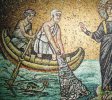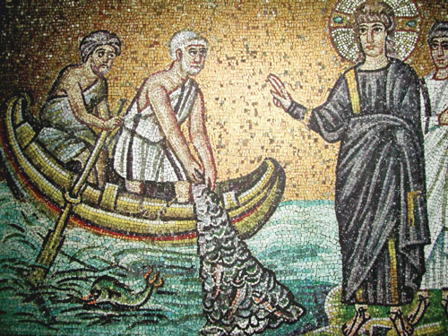 Atunci, „pe malul Mării Galileii”3 (Mt 4, 18 şi Mc 1, 16), Iisus cheamă pe primii patru ucenici, eveniment raportat de către cele trei Evanghelii Sinoptice. Istorisirile lui Matei şi Marcu (adică ale lui Petru, care este unul dintre participanţii la această scenă) corespund, în timp ce aceea a lui Luca este destul de diferită şi comportă un eveniment foarte important, care este pescuirea minunată4. Totul începe aproape banal: Domnul se plimbă pe malul lacului; vede doi pescari care aruncau „mreaja”5, doi fraţi: Simon6 şi Andrei. El îi cheamă: „Veniţi după mine [„urmaţi‑mă”, adică veniţi în urma Mea] şi vă voi face pescari de oameni”. Aici recunoaştem minunata pedagogie a lui Hristos: El pleacă de la ceea ce este concret, material, văzut, pentru a ne duce la înţelesul duhovnicesc, invizibil. Pescarii lasă totul (barca şi plasele) şi‑L urmează. Îl cred pe cuvânt. Apoi Domnul merge puţin mai departe şi vede altă barcă cu doi fraţi, Iacob şi Ioan, care „descurcau mrejele”, cu tatăl lor, Zebedeu, şi cu nişte muncitori (zilieri). Îi cheamă şi pe Iacob şi Ioan, care lasă totul (pe tatăl lor dimpreună cu muncitorii, barca, plasele) pentru a‑L urma. De la Sf. Luca ştim că Iacob şi Ioan erau tovarăşii lui Simon. Cu toţii aveau o mică afacere familială, al cărei patron era Simon7.