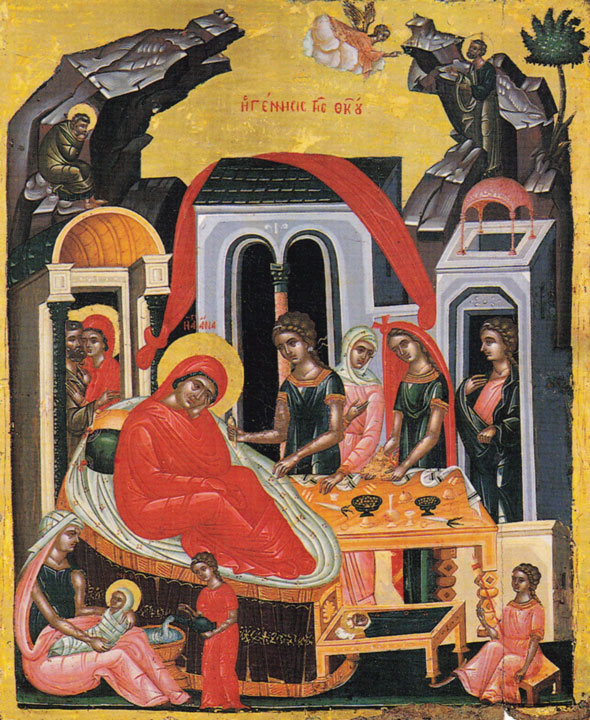 Astăzi s-a zidit Uşa cea spre răsărituri, Uşa prin care Domnul va intra şi va ieşi şi ea va rămâne încuiată. Uşa dintru care este Hristos, Uşa oilor, răsăritul este numele Lui, prin Care am dobândit întoarcerea către Tatăl, începătorul Luminii. Astăzi a suflat vânt subţire mai înainte vestitor de bucuria cea a toată lumea. Veselească-se cerul de sus şi să se bucure pământul de jos, să se clatine marea lumii, că întru dânsa se naşte Scoica cea mare, care din cer, din fulgerul Dumnezeirii, va lua în pântece şi va naşte pe Hristos, Mărgăritarul cel de mult preţ. Scoica din care Împăratul Măririi ieşind şi cu porfira trupului îmbrăcându-Se şi venind la cei robiţi, le va propovădui iertarea. Să salte firea, că se naşte mieluşeaua din care Păstorul Se va îmbrăca în chip de oaie şi hainele de moarte cele de demult le va rupe. Să dănţuiască fecioarele, că s-a născut Fecioara care, după cum a zis Isaia, va avea în pântece şi va naşte fiu şi vor chema numele lui Emanuel, adică: cu noi este Dumnezeu. Bine este cuvântat Cel ce vine în numele Domnului. Dumnezeu este Domnul şi S-a arătat nouă. Să tocmim prăznuire pentru naşterea Născătoarei de Dumnezeu. Veseleşte-te tu, Ana cea fără de fii, ceea ce nu puteai să naşti! Bucură-te, Ioachime, că din fiica ta Prunc S-a născut nouă, Fiul şi S-a dat nouă şi se cheamă numele lui Înger de mare Sfat, mântuirea cea a toată lumea, Dumnezeu tare! Oricine nu mărturiseşte pe Sfânta Fecioară ca Născătoare de Dumnezeu, afară de Dumnezeu este. Nu este al meu cuvântul, chiar dacă al meu este cuvântul. Ca moştenire l-am primit pe acesta de la Cuvântătorul de Dumnezeu, Părintele Grigorie Teologul.