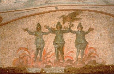 Dacă ne îndreptăm atenția către arta creștină vom descoperi că în iconografia catacombelor există multe reprezentări cu sfinți rugându-se în această ipostază. Dintre toate, putem aminti: pe cele din catacombele Sfintei Priscilia, între care se evidențiază o frescă în care o femeie este reprezentată în picioare și cu mâinile întinse în chipul crucii (Fig. 1), și o altă frescă reprezentând pe cei trei tineri din Babilon, care, fiind în mijlocul văpăii, se roagă cu mâinile întinse către cer (Fig. 2); pe cele din catacombele din Via Anapo (Roma), unde se găsește o reprezentare cu Prorocul Daniil în groapa cu lei; iar în catacombele de la San Gennaro (Napoli) se găsesc scene cu creștini care se roagă cu mâinile întinse.
