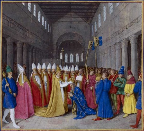 Dar cum s-a ajuns la o nouă concepţie despre imperiul creştin şi la concurenţa dintre papă şi împărat pentru puterea imperială în Occident? Pregătită la curtea carolingiană, în special de Alcuin, principalul sfetnic al lui Carol cel mare, ideea creării unui nou imperiu occidental era prezentă şi la Roma în mediile pontificale. Ceremonia încoronării lui Carol cel Mare la Roma, în anul 800, de către papa Leon al III-lea, traduce aceste noi idei: dincolo de concurenţa pentru supremaţie, papa şi împăratul se vor sprijini unul pe celălalt pentru a-şi consolida puterea în spaţiul occidental. Pe lângă faptul de a fi uns ca un nou „David”, după încoronarea practicată de regii carolingieni, Carol cel Mare este de acum înainte şi un nou „Augustus”, stăpân peste un imperiu care se autointitulează „roman”, în timp ce imperiul bizantin, prins încă în criza iconoclastă, este denigrat (pretextul fiind că tronul împăratului a fost uzurpat de o femeie, împărăteasa Irina). Mai târziu, Carol cel Mare va obţine o recunoaştere din partea împăratului bizantin Mihai I şi, teoretic, vor coexista doi împăraţi „fraţi”, unul în Occident şi unul în Orient; însă acest compromis a fost de scurtă durată. Pe de-o parte, unitatea imperiului lui Carol cel Mare ia sfârşit la moartea succesorului său Ludovic, imperiul fiind împărţit între cei trei fii ai săi. Însă fragmentarea politică ce urmează, care este la originea statelor Europei occidentale, nu pune capăt operei lui Carol cel Mare, ale cărui reforme, inclusiv în interiorul Bisericii îşi continuă efectele. Pe de altă parte, imperiul bizantin, confruntat cu avansarea musulmană, îşi restrânge frontierele la dimensiunile unui imperiu oriental, din ce în ce mai elenizat, şi păstrează doar câteva posesiuni în sudul Italiei. Concurenţa dintre cele două imperii va fi dublată de pretenţiile papei la o absolută supremaţie în lumea creştină. Apusul va fi marcat timp de secole de ideea că nu poate fi decât un suveran creştin cu vocaţie universală (în sensul acesta imperiul creştin este mai mult decât un regat creştin, căci are vocaţie universală). Gândirea occidentală se depărtează de cea bizantină şi în planul acesta, tinzând din ce în ce mai mult să justifice teologic construcţia unei împărăţii a lumii acesteia, condusă de un fel de reprezentant al lui Hristos pe pământ. Asistăm deci în această perioadă la naşterea unui nou spaţiu politic, cultural şi religios, Europa, care apare în opoziţie cu Bizanţul, şi în sânul acestor două imperii, Biserica cunoaşte o ruptură din ce în ce mai adâncă între partea de cultură latino-germanică şi partea grecească, ruptură care va duce la marea schismă din 1054, aşa cum vom vedea în continuare.