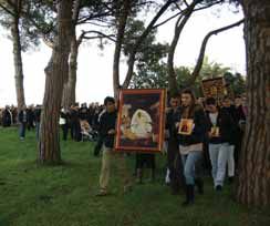 Ajunşi în faţa reşedinţei eparhiale, "pelerinii icoanelor" au format un cerc larg, răspunzând cu "Doamne miluieş- te!" la cererile înălţate de diaconi către Dumnezeu, pentru pacea şi bunăstarea Bisericii şi a întregii lumi, după care au ascultat cuvântul de bun venit şi de învăţătură, rostit de Preasfinţitul Siluan, Episcopul Episcopiei Române Ortodoxe a Italiei.