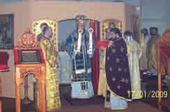 Sărbătoarea a început după rânduială, cu slujba Vecerniei unită cu Litia, săvârşită de Preasfinţitul Părinte Macarie, fondatorul parohiei noastre, aflat pentru prima dată în vizită la noi în noua sa demnitate de Episcop al românilor din Europa de Nord. Ne-au fost alături părintele Samuel de la parohia greacă din Leeds şi părintele Dumitru, diaconul Preasfinţitului Macarie. Grupul Nectarie Protopsaltul de la Bucureşti a dat răspunsurile la strană. Cu toţii am simţit atmosfera de rugăciune a sărbătorii, icoanele cu lumânările pâlpâind, slujba arhierească şi cântările psaltice contribuind din plin la clădirea acestor simţăminte în inimile celor câteva zeci de oameni prezenţi la slujbă.