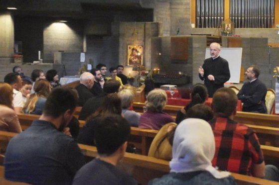 Părintele ne‑a vorbit viu și cald despre Sfânta și Dumnezeiasca Liturghie, folosindu‑se de conceptul de icoană pentru a revela aspecte importante ale acesteia. Am descoperit astfel că Sfânta Liturghie poate fi văzută și înțeleasă ca o icoană a milei, a păcii, a iubirii, a bucuriei, a veșniciei, sau ca un schimb de daruri între Dumnezeu și om, văzut și el ca icoană vie, asemenea chipului1. Temele de meditație la care am fost invitați în această prelegere au continuat și a doua zi, prin participarea la Sfânta Liturghie, dar și prin agapa pregătită cu dragoste de parohia românească din Berna.