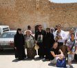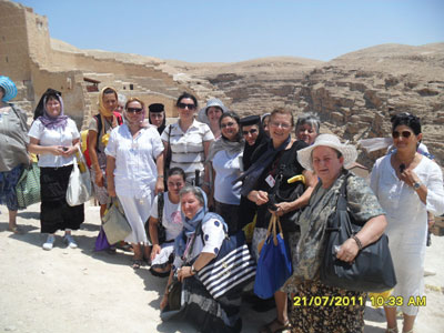 Luni, 25 iulie. Deja încep nostalgia şi regretele apropiatei întoarceri acasă. Mai vrem să stăm aici, la Domnul! Ieşim foarte devreme azi de la Aşezământ, pentru a beneficia de răcoarea dimineţii. Avem de urcat şi de coborât mult în dimineaţa asta, căci vizităm mănăstirea Hozeva, unde se află Sfântul nostru, Ioan Iacob de la Neamţ. Ajungem destul de uşor, căci este numai de coborât până la mănăstire. În faţa sfântului ne aşezăm tot grupul în genunchi şi recităm poezii din volumul Dor de pustie, dor de cer al cărui autor este. Îi auzim vocea prin glasul poeziilor sale şi lăcrimăm cu toţii de mila orfanului care‑şi plânge bunica şi părinţii morţi, fiind „adoptat” de Părintele ceresc. Cu greu ne desprindem de sfintele moaşte. Ştim că Sfântul s‑a bucurat de prezenţa noastră, o simţim în inimi. Urcând treptele unei scări, ajungem la peştera în care a locuit Sfântul Ilie din poruncă dumnezeiască după ce a închis cerul, fiind hrănit cu pâine şi carne de către corbi. Locuri aspre, sălbatice, pustii, în care proroci şi călugări L‑au întâlnit pe Dumnezeu. Întoarcerea la autocar este o adevărată aventură. Urcăm sute de metri pe o căldură de cincizeci de grade, înconjuraţi de beduini care ne propun cu încăpăţânare serviciile de „taxi‑măgăruş”, cum numesc ei transportul pe bietele animale. În sfârşit ajungem la aerul condiţionat din autocar! După mai bine de o oră de drum, iată‑ne iar în preajma Ierusalimului, într‑o zonă de periferie din vestul oraşului numită în trecut Ein Kerem, patria Sfântului Ioan Botezătorul. Mai întâi intrăm în spaţiul mănăstirii cu hramul Înaintemergătorului Ioan. Intrăm în biserica veche, mai mică, a mănăstirii, Biserica Vizitării, amintind locul în care Sfânta Elisabeta a întâmpinat‑o pe Maica Domnului având în pântece Pruncul dumnezeiesc: „Şi de unde mie cinstea aceasta, ca sa vină la mine Maica Domnului meu?” Sărutăm un lung şir de icoane cu sfinte moaşte încastrate şi admirăm frumoasa combinaţie de stiluri arhitectonice, gotic şi rusesc, a bisericii. Urcând apoi câteva zeci de metri, ajungem la biserica nouă, dedicată aceluiaşi episod evanghelic al Vizitării. Aceasta este construită în cel mai curat stil monumental moscovit, având turlele, bineînţeles, acoperite cu aur! Ajungem acum la Even Sapir, unde se află peştera în care a vieţuit Sfântul Ioan Botezătorul din momentul în care a fost dus acolo de mama sa, la vârsta prunciei, şi până la ieşirea sa ca propovăduitor şi Înaintemergător al lui Hristos. După ce bem din apa izvorului Sfântului Ioan, ne închinăm în peşteră. Admirăm o icoană a Mântuitorului reprezentat ca un Miel cu aureolă divină. Ne întoarcem la Ein Kerem, la Biserica Naşterii Sfântului Ioan Botezătorul, catolică. Sărutăm steaua ce indică locul precis al naşterii. „Hic Praecursor Domini Natus Est”. În curtea bisericii găsim, precum la biserica Pater Noster, de data aceasta imnul de mulţumire al Sfântului Zaharia, tatăl Botezătorului, în limba română. Fotografie de grup.
