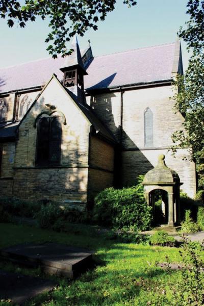 Clădirea bisericii datează din anul 1885, fiind construită în stil basilical roman cu elemente gotice. Biserica se găseşte pe lista clădirilor de patrimoniu din Anglia, având statutul de monument istoric gradul II. Rădăcinile creştine ale locului sunt însă cu mult mai vechi, datând din anul 1180, secolul XII găsind, de altfel, întreaga regiune bine organizată din punct de vedere ecleziastic, cu episcopie la York şi comunităţi creştine bine înfiripate aici încă din primul mileniu creştin. Astfel, primul episcop de York, Sf. Ierarh Paulinus (secolul VII), după o intensă lucrare misionară în Northumbria, a construit o biserică de lemn în Campoduno, numele roman al oraşului Leeds de astăzi.
