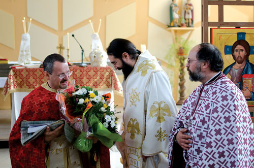 A urmat apoi sfinţirea Darurilor şi împărtăşirea cu Sfântul Trup şi Scump Sângele Domnului, după care Părintele Mitropolit l‑a hirotesit pe părintele Cătălin, oferindu‑i, în cadrul unui moment deosebit de emoţionant, crucea şi rostind un cuvânt de învăţătură în această biserică închinată Sfinţilor Cosma şi Damian, unde, cu această ocazie, a slujit pentru prima dată, având în vedere că parohia de la Lyon săvârșește aici slujbe abia începând cu 18 decembrie 2011.