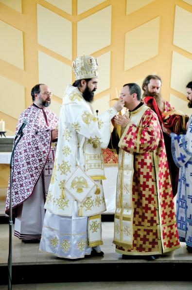 După acest moment, diaconul Mihnea Pop a înconjurat masa altarului împreună cu cei doi preoţi prezenţi, părintele Cătălin Cordoş şi părintele Nicodim, urmând să primească din partea episcopului epitrahilul, brâul, felonul şi Liturghierul, în timp ce toţi cei prezenţi au strigat cu inima plină de bucurie Axios.