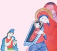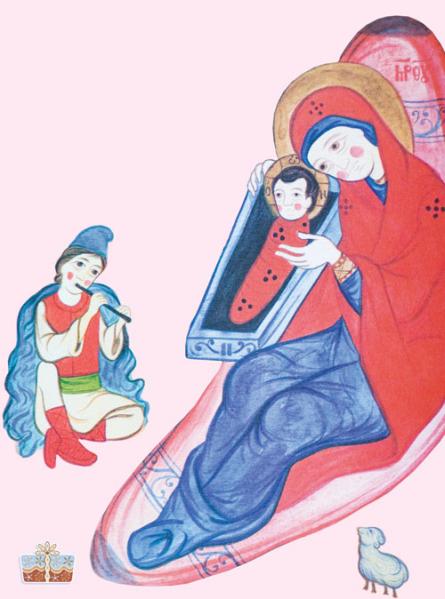 Ala crèche de Bethléem sont venus des bergers, parmi lesquels il y avait un enfant. Comme ils se tenaient là, les mages arrivèrent aussi, et offrirent leurs présents à Jésus. N’ayant rien à donner d’autre, l’enfant sortit la flûte qu’il portait attachée à sa ceinture et se mit à jouer. Mais observant les richesses envoyées par les mages, il s’attrista et cessa de jouer. Alors l’Enfant se mit à gigoter et à pleurer. La mère de l’Enfant dit au petit berger : « Je t’en prie, joue encore ». Alors il se remit à jouer. Le visage de l’Enfant s’éclaira et un doux sourire semblait vouloir dire « Merci ! » au berger.