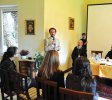 Le lundi 4 juin, jour particulièrement animé par l’Esprit saint et Seigneur, le festival – car c’en était vraiment un, festival de foi orthodoxe, de prière et de réflexion avec la « pensée du Christ » – s’est ouvert par la célébration de la divine liturgie, véritable « ciel sur la terre », présidée par S.E. l’évêque Silouane, assisté de deux prêtres (un Roumain et un Français) et d’un très compétent hiérodiacre du Monastère. Le tropaire de la Pentecôte – « Bénis sois-Tu, ô Christ notre Dieu, qui as rendu maîtres en sagesse de simples pêcheurs, leur envoyant le saint Esprit, et, par eux, prenant au filet le monde entier ! » – ne cessait de retentir, tantôt en roumain, tantôt en français. La beauté du Christ rayonnait des saintes icônes et des saints mystères, dans l’église du Siège épiscopal du Diocèse roumain d’Italie.