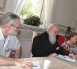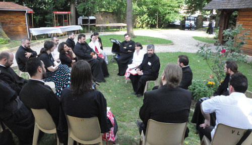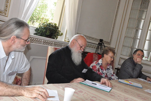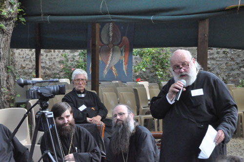 Père Noël Tanazacq a développé avec le charisme de l’audace un tableau historique, où les richesses et les faiblesses des Eglises d’Orient et d’Occident ont été signalées, notamment depuis le grand schisme et la prise de Constantinople par les Croisés. Mais, suivant une discussion développée dans un des groupes, la notion de « christianisme occidental » désigne surtout le christianisme tel qu’il s’est développé en Europe de l’Ouest depuis la fin du Moyen Age, avec un accent mis sur l’action extérieure et le rationalisme ; les chrétiens des régions occidentales étaient aux premiers siècles, à l’époque mérovingienne par exemple, plutôt proches de l’esprit appelé « oriental », centré en ce qui le concerne sur l’expérience de la grâce du saint Esprit, la prière et l’ascèse, comme le montre la vie de saint Martin ou celle de sainte Geneviève. Père Noël a plaidé avec émotion pour une synthèse ecclésiale, à notre époque, des vertus réciproques de l’Occident et de l’Orient considérés comme des notions symboliques. Il a rappelé également la question posée par l’utilisation de formes occidentales de l’expérience liturgique, notamment par le saint archevêque Jean de San Francisco.