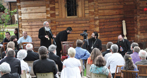 Monseigneur Séraphim a montré, avec l’enthousiasme charismatique que nous aimons en lui, que la prière dans le monde contemporain constitue la façon la plus profonde et la plus efficace d’assumer la modernité1 de la foi chrétienne orthodoxe. Par la prière, particulièrement celle du Coeur, le croyant se situe au centre du monde, il le porte, il intercède pour lui, il l’aide, il y diffuse l’amour du Christ pour tous. Le Métropolite a rappelé également que saint Païssie conseillait la pratique de la Prière au sein des offices liturgiques, non parce que ceux-ci seraient trop longs, mais afin qu’ils ne soient pas seulement « corporels », c’est-à-dire extérieurs et formels. La Prière nourrit la célébration de l’intérieur, elle lui donne sa profondeur, elle y attire les dons charismatiques de l’Esprit. Symétriquement, cette prière s’accompagne nécessairement d’une participation du corps, surtout dans la chambre ou la cellule, par les prosternations (métanies), où le corps participe à l’oraison du coeur, est purifié et sanctifié.